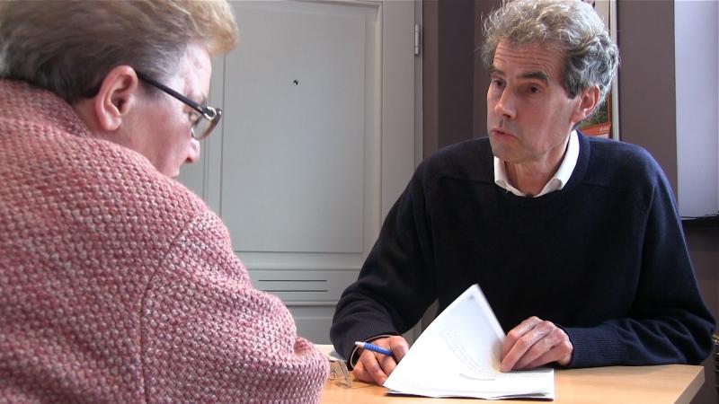 Jean-Pierre, bénévole accueillant social, aide une bénéficiaire à comprendre ses documents