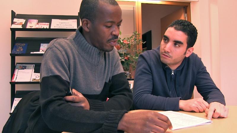 Omar, bénévole accompagnant, aide Monsieur Y. dans sa recherche de logement.